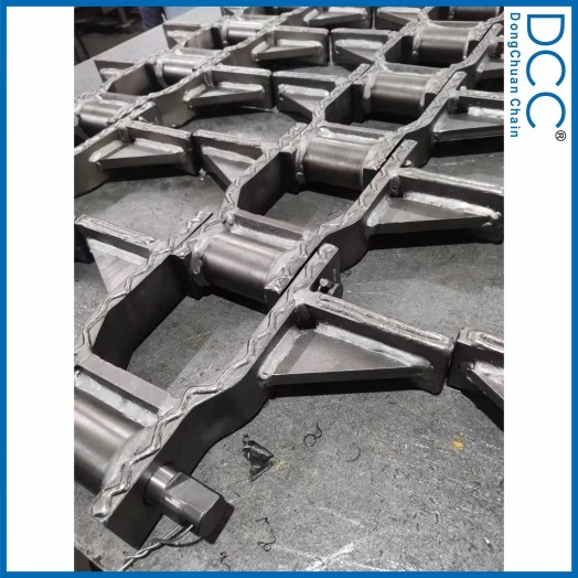熱處理后達到很高的抗拉強度和耐磨性,套筒,銷軸采用表面高頻的工藝,提高了表面的硬度,使鏈條具有超高的耐磨性。鏈條的鏈板和刮板兩側采用高耐磨焊絲堆焊的工藝,用國內先進的高耐磨焊絲,通過焊接機器人自動焊接,使得焊縫均勻的堆焊在鏈板兩側,同時,在鏈條其它容易磨損的地方也都采用了耐磨焊絲堆焊的工藝,使整個鏈條都具備超高的耐磨性,耐磨焊絲焊接后表面硬度可以達到HRC50-60,能長時間使用鏈條不磨損。