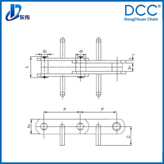 | Chain no. | Pitch P (mm) | Diameter of roller d1 (mm) | Diameter of pin d2 (mm) | Length of pin L (mm) | Inner width of inner link b1(min) (mm) | Thickness of sidebar t (mm) | Height of sidebar h1 (mm) | Height of attachment c (mm) | Tensile strength q (min) (KN) |